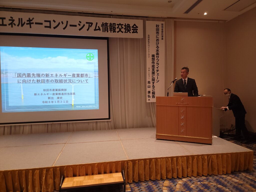 続いて、合同会社デロイト トーマツ マネージャーの鳥山康弘氏より、環境省委託事業として実施された「秋田市における水素サプライチェーン構想作成支援」の進捗報告が行われました。本事業は、秋田市およびANECと連携し、地域再生可能エネルギーを活用した水素利活用モデルの構築を検討するものです。